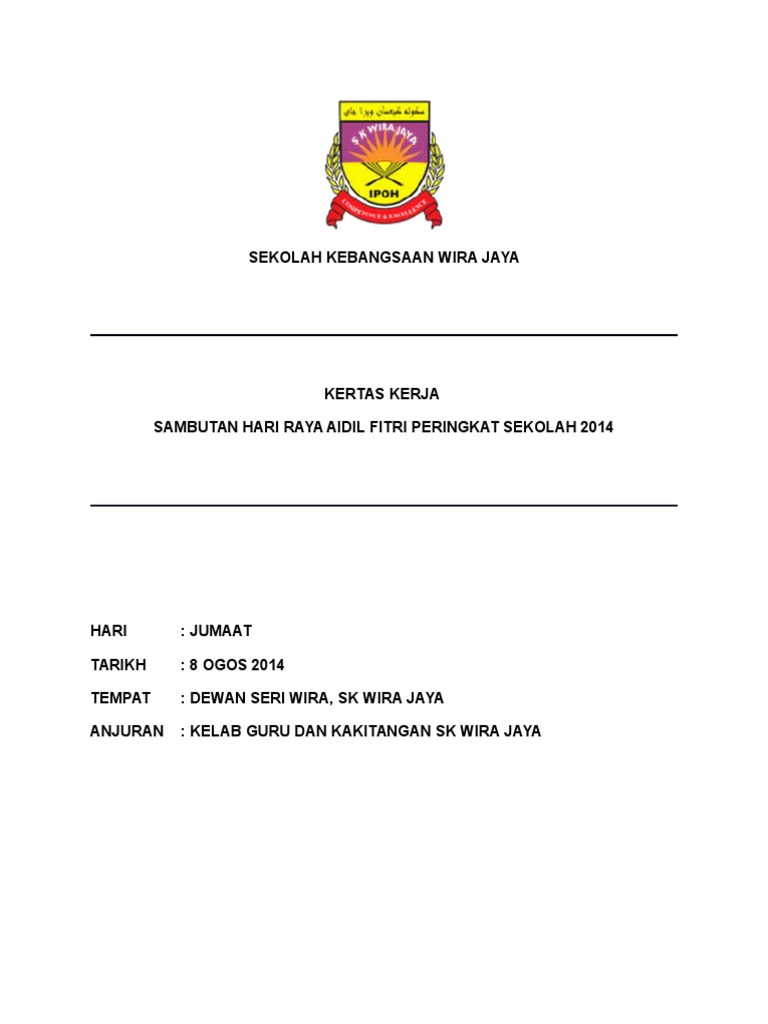 23 september 2011 hari : Kertas kerja sambutan hari raya peringkat sekolah 2017 Antara tetamu istimewa yang hadir ialah tuan pegawai pejabat pelajaran daerah iaitu tuan haji mohamad jamil bin md noh. Doc kertas kerja program sambutan hari raya aidilfitri peringkat sekolah kebangsaan kampung busut baru zaifi ras academia edu. Rasional program ini juga amat bermakna bagi semua warga sekolah kerana dapat mengeratkan silaturrahim di antara satu sama lain.