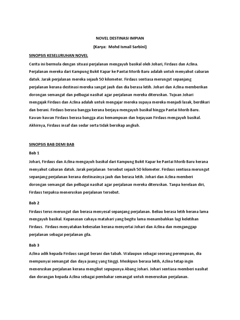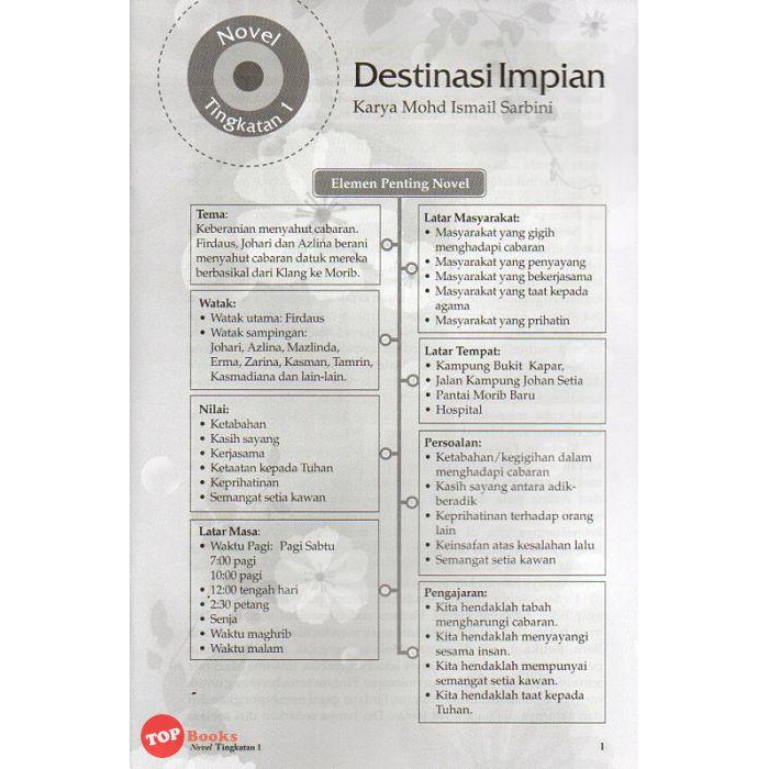 Pengajaran (novel tingkatan 1) pengajaran kita janganlah mempunyai perasaan hasad dengki dalam diri. These pictures of this page are about:komsas tingkatan 1. Dua orang anak muda iaitu amir dan usamah yang berwawasan tinggi dan masih menuntut telah memanfaatkan ilmu yang dipelajari dengan melakukan inovasi terhadap mesin rumput terpakai. Kupasan komsas super tingkatan 1 destinasi impian. Pelari muda novel tingkatan 1. Novel destinasi impian online activity for tingkatan satu. Read 2 reviews from the world's largest community for readers. Novel destinasi impian other contents. Senarai novel bahasa melayu komsas tingkatan 1 hingga 5. Mohd ismail sarbini merupakan seorang guru yang banyak menulis buku di malaysia. Firdaus yang bercakap besar terpaksa memberanikan diri untuk menyelamatkan mazlinda tetapi akhirnya dia yang lemas. Mereka ingin membuktikan kepada datuk mereka bahawa mereka juga boleh berbasikal ke morib seperti yang pernah dilakukan oleh datuk. Senarai novel komponen sastera tingkatan 1 hingga 5 dari tahun 2000 hingga 2019.
