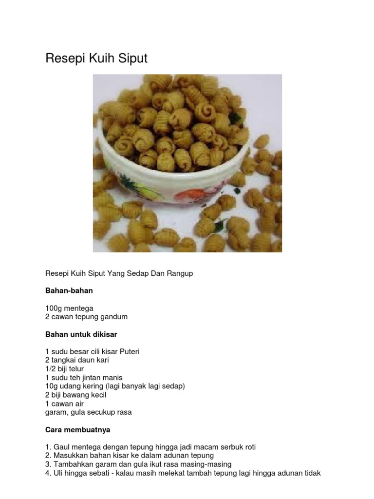 Resepi Kuih Siput Rangup Tetapi Lembut Dengan Aroma Wangi Daridapur Com from daridapur.com Resepi kuih siput resepi bonda mp3 & mp4. Resepi kuih siput| kuih tradisonal. Kuih siput adalah sejenis kuih yang dibuat daripada tepung gandum, tepung ubi dan marjerin. Resepi kuih siput kuih tradisional try masak icookasia kuih raya. Ambil sedikit adunan dan lenyekkan di atas acuan kuih siput. 1 kg tepung gandum 15 gm udang geragau* 10 gm jintan manis* 10 gm jintan putih* 2 biji telur 200 gm marjerin 10gm serbuk lada (cili powder) 15gm rempah kari 2 sudu kecil garam 200 ml air daun kari secukupnya minyak masak. Ia kemudian dicampur rempah dan dibentuk siput dengan menggunakan acuan sebelum digoreng dengan minyak masak menggunakan api serdahana perlahan sehinga ia kekuningan dan di angkat. Berbaloi memasak sendiri kerana rasanya memang sangat sedap.