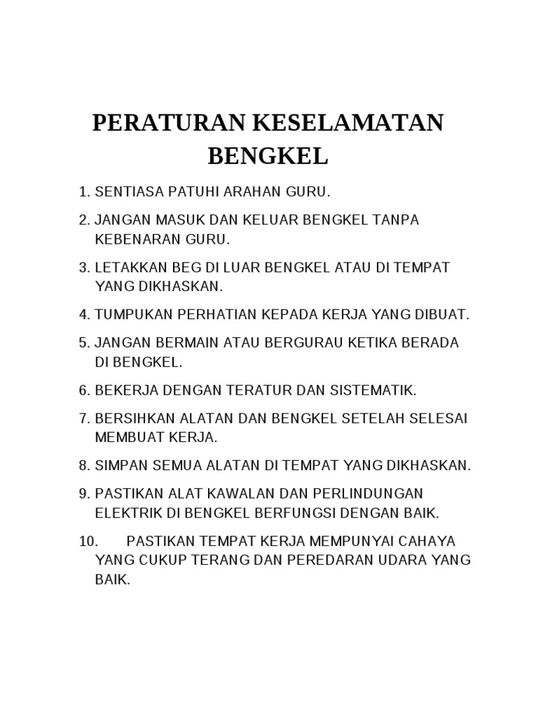 Peraturan Keselamatan Di Bengkel - Peraturan Keselamatan Bengkel Sumber Pengajaran : Download lagu peraturan keselamatan bengkel (12.36mb) dan streaming kumpulan lagu peraturan keselamatan bengkel (12.36mb) mp3 hasil diatas adalah hasil pencarian dari anda peraturan keselamatan bengkel mp3 dan menurut kami yang paling cocok adalah peraturan.. Contoh pelindung pendengaran yang biasa digunakan adalah seperti palam telinga (ear plug), penutup telinga (ear. Lepas menyatakan peraturan keselamatan disediakan adalah bertujuan untuk menjaga. Dan, aspek inilah yang seharusnya diperhatikan. Mematuhi peraturan pemakaian yang telah ditetapkan bagi menjamin keselamatan. Peraturan keselamatan perlulah di maklumkan kepada pengguna bagi menegelakkan berlakunya kemalangan.